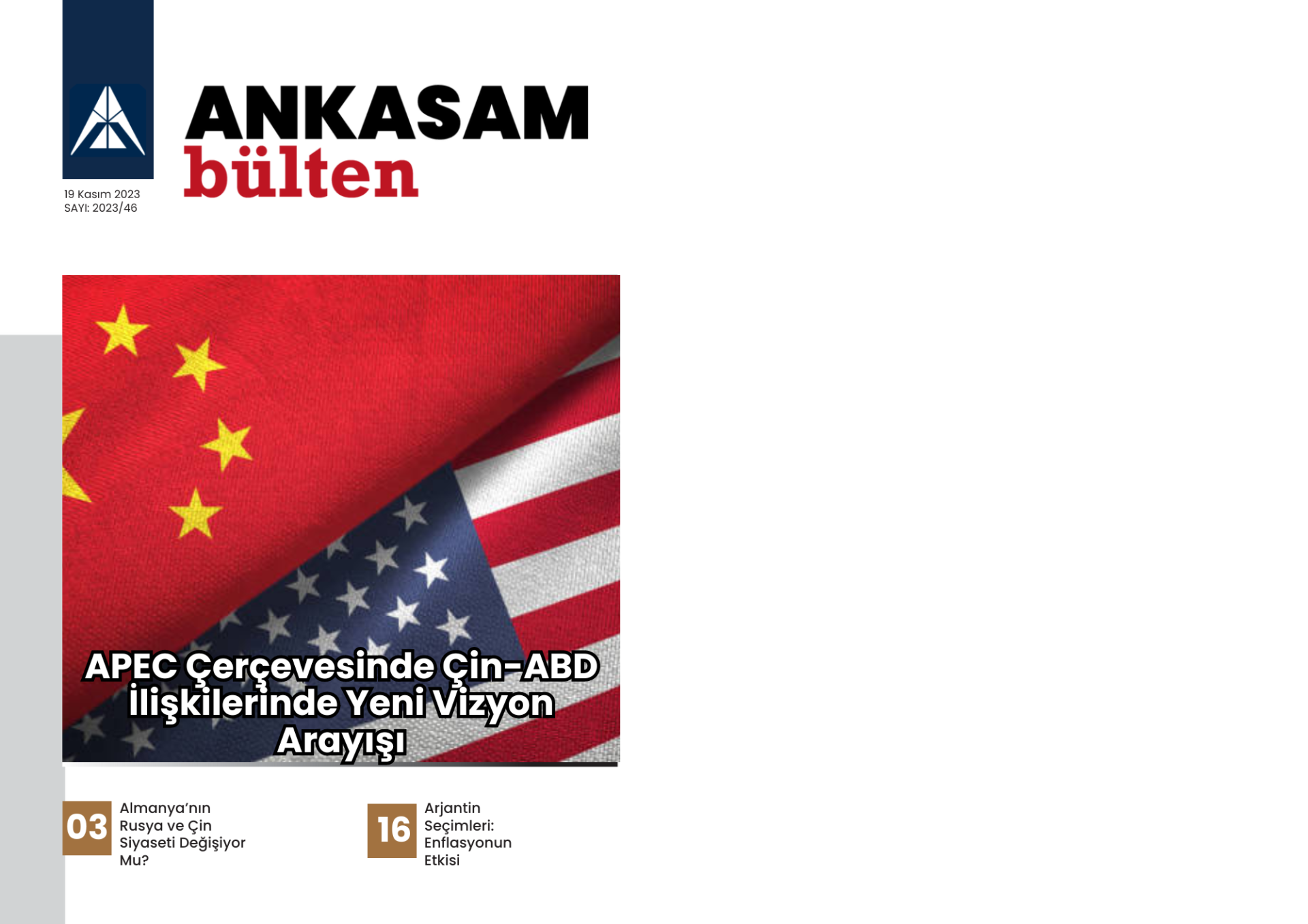 13 Kasım – 19 Kasım 2023 tarihleri arasında ANKASAM tarafından gerçekleştirilen faaliyetlerin sizlere toplu bir şekilde sunulduğu Haftalık Bülten yayımlanmıştır. ANKASAM Haftalık Bülten’de; haftanın bütün analizleri, ANKASAM Bakış değerlendirmeleri ile ANKASAM danışman ve uzmanlarının medya faaliyetleri yer almaktadır.