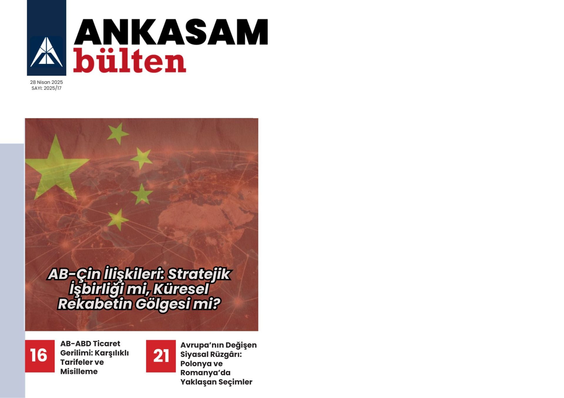 21 Nisan – 27 Nisan 2025 tarihleri arasında ANKASAM tarafından gerçekleştirilen faaliyetlerin sizlere toplu şekilde sunulduğu Haftalık Bülten yayımlanmıştır. ANKASAM Haftalık Bülten’de; haftanın bütün analizleri, ANKASAM Bakış değerlendirmeleri ile ANKASAM danışman ve uzmanlarının medya faaliyetleri yer almaktadır.