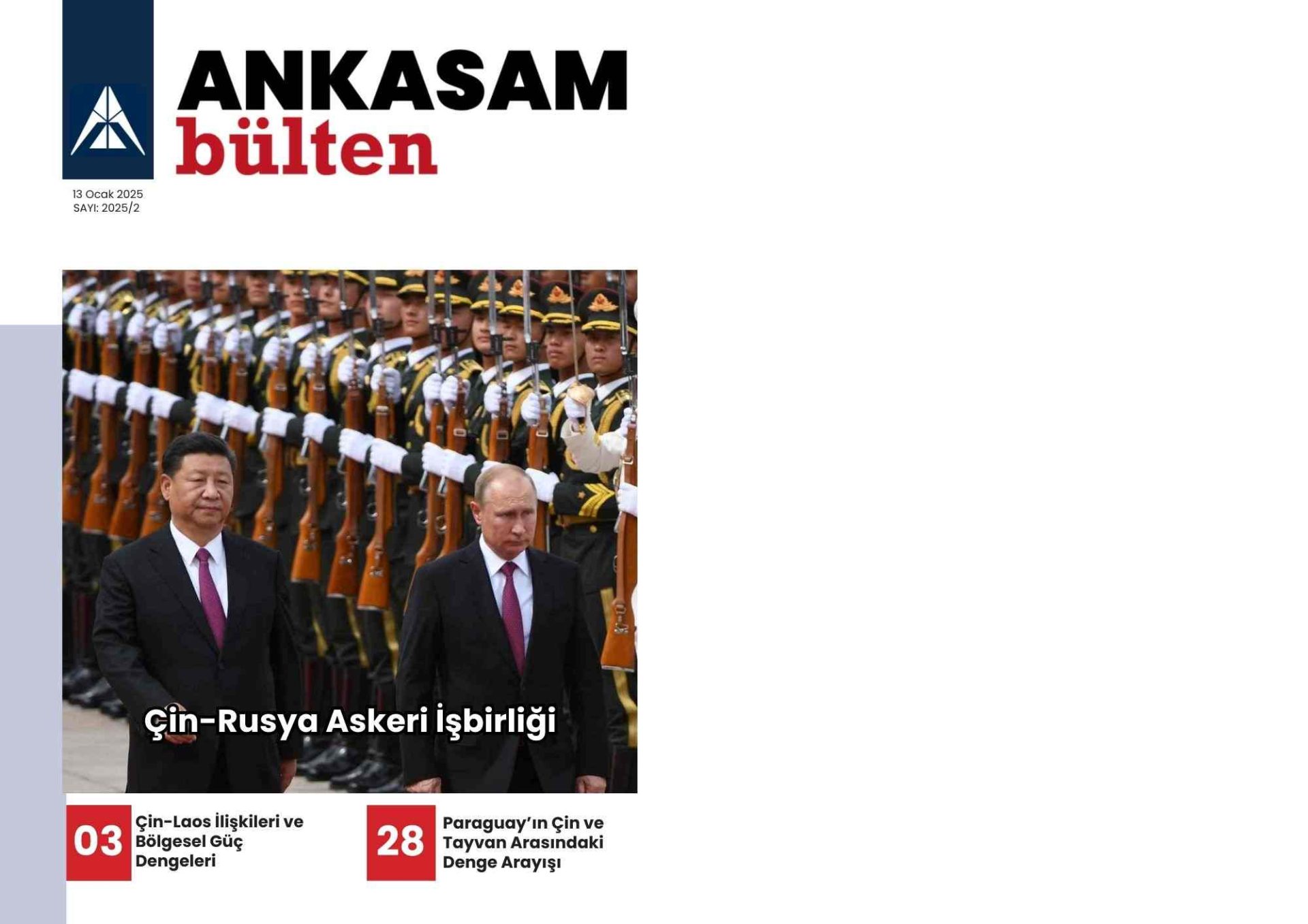 06 Ocak – 12 Ocak 2025 tarihleri arasında ANKASAM tarafından gerçekleştirilen faaliyetlerin sizlere toplu şekilde sunulduğu Haftalık Bülten yayımlanmıştır. ANKASAM Haftalık Bülten’de; haftanın bütün analizleri, ANKASAM Bakış değerlendirmeleri ile ANKASAM danışman ve uzmanlarının medya faaliyetleri yer almaktadır.