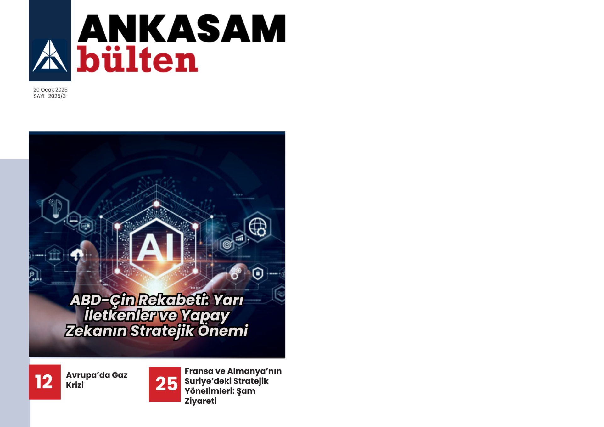 13 Ocak – 19 Ocak 2025 tarihleri arasında ANKASAM tarafından gerçekleştirilen faaliyetlerin sizlere toplu şekilde sunulduğu Haftalık Bülten yayımlanmıştır. ANKASAM Haftalık Bülten’de; haftanın bütün analizleri, ANKASAM Bakış değerlendirmeleri ile ANKASAM danışman ve uzmanlarının medya faaliyetleri yer almaktadır.