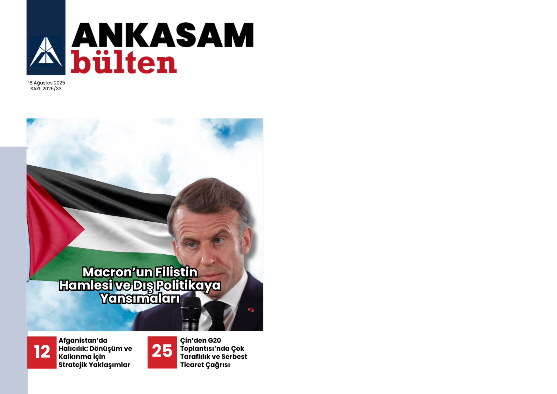 11 Ağustos – 17 Ağustos 2025 tarihleri arasında ANKASAM tarafından gerçekleştirilen faaliyetlerin sizlere toplu şekilde sunulduğu Haftalık Bülten yayımlanmıştır. ANKASAM Haftalık Bülten’de; haftanın bütün analizleri, ANKASAM Bakış değerlendirmeleri ile ANKASAM danışman ve uzmanlarının medya faaliyetleri yer almaktadır.